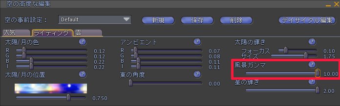 世界 > 環境の設定 > 環境編集 > 空の高度な設定 > ライティング > 風景ガンマ