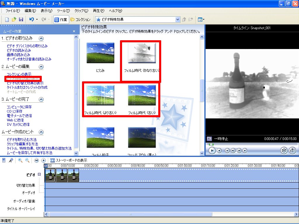 「ビデオ特殊効果」より「フィルムの時代」を選び、取り込んだ画像や動画にドラッグしてみてください。