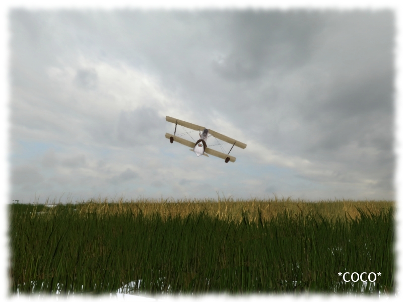 雲行き怪しい空に飛び交う一台のプロペラ飛行機。